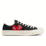 Add a bold twist to your sneaker game with the CDG Converse Big Heart Low Top (Black) β a collaboration between Comme des GarΓ§ons PLAY and Converse that blends timeless design with playful streetwear flair. The low-top silhouette, crafted in classic black canvas, is accented by the signature red heart logo peeking from the side panel. This instantly recognizable detail brings personality and style to an otherwise minimalist profile.